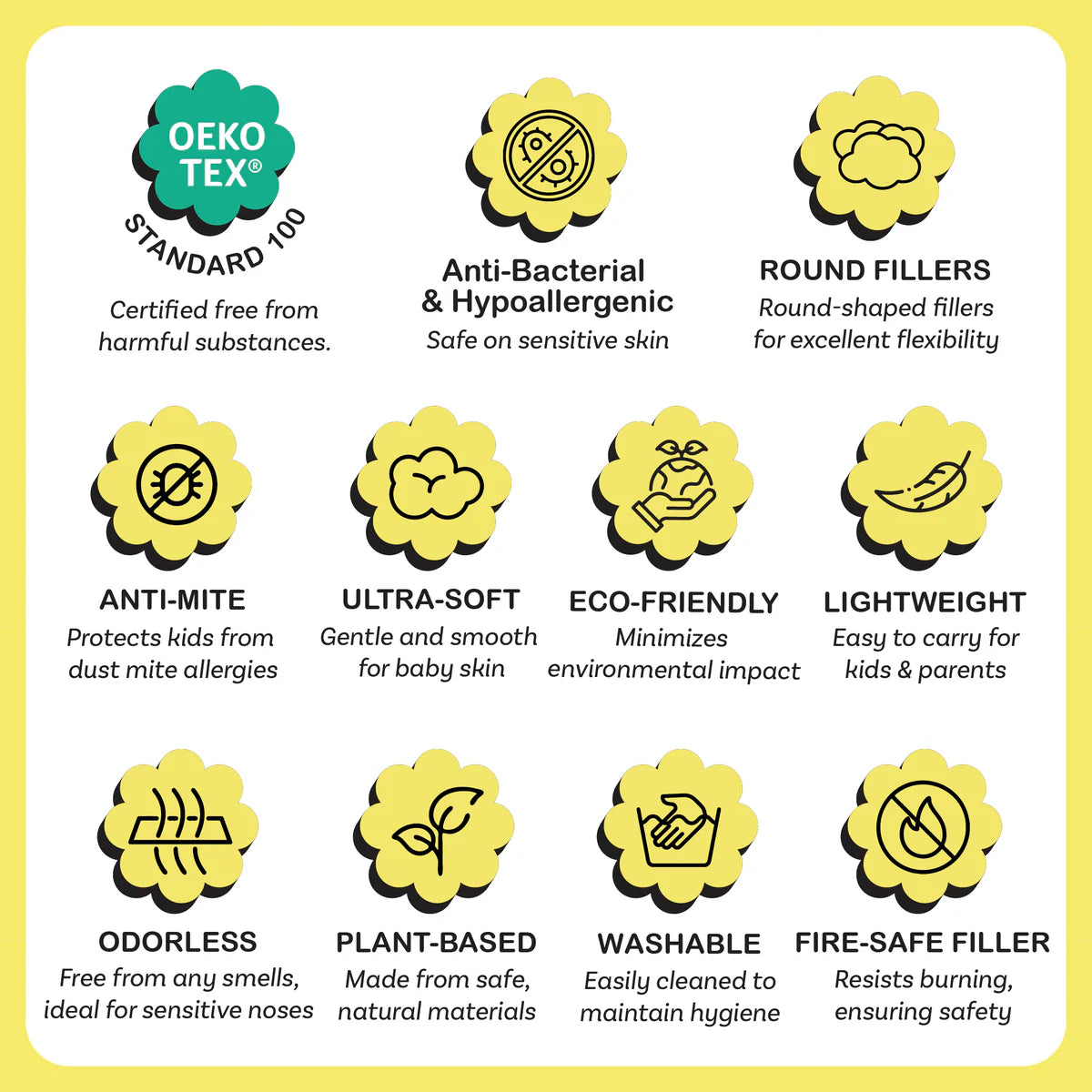 • Natural Properties: The fabric used in the Bed-Time Buddy™ has natural anti-mite and odorless properties, contributing to a healthier and more pleasant sleep environment. These qualities ensure that the Bed-Time Buddy™ remains safe and comfortable for all users.