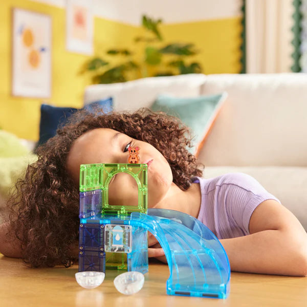 Get ready for a rolling good time with the MAGNA-TILES Hamster Ball Set —the perfect gift for animal lovers and builders alike! This set brings motion and creativity to life with the all-new Slide attachment. Place the adorable hamster in its magnetic and watch it roll down around twists and turns. Enhance the fun with microMAGS decorations, inspiring imaginative designs and creative play. The included Fence and Gate pieces add structure and strategy, helping to guide the hamster’s path while keeping the excitement on track. Whether as a standalone set or an add-on to the MAGNA-TILES Pet Playhouse, this set combines hands-on fun with engaging features to spark hours of pretend play and exploration!