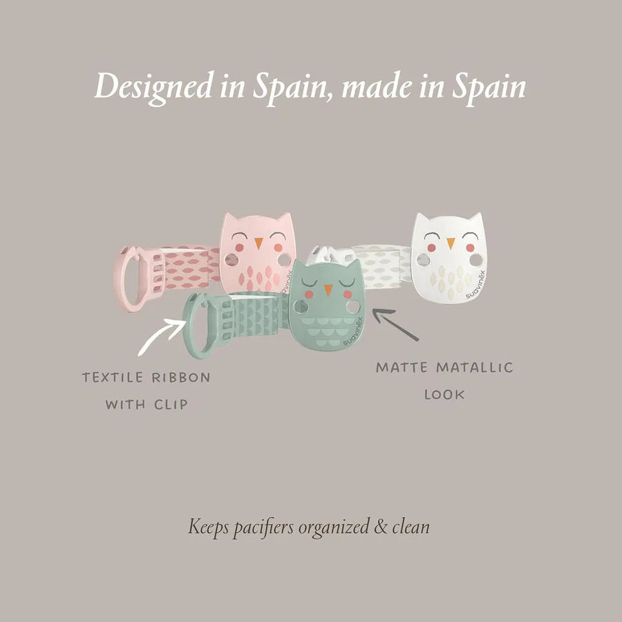 Dummy clip with ribbon adds a stylish touch to baby's outfit.