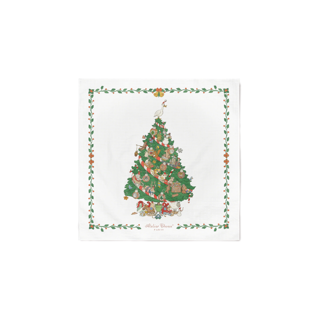 Each design features whimsical illustrations by Mattias Adolfsson, a Swedish artist known for his intricate, imaginative style. Featuring a magnificent holiday tree brimming with playful animals, and wrapped gifts, this carré is sure to bring charm and celebration to everyday moments.