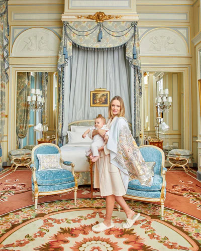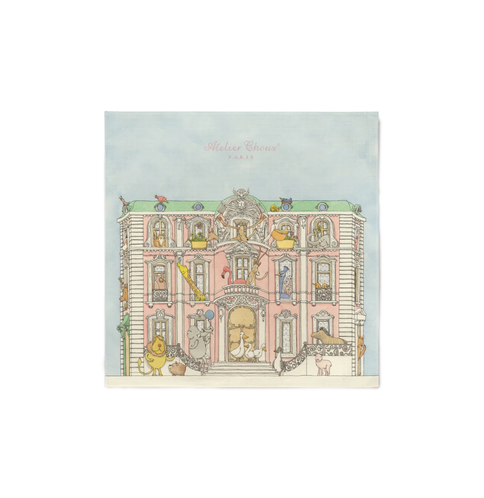 Each design features whimsical illustrations by Mattias Adolfsson, a Swedish artist known for his intricate, imaginative style. Featuring the charming facades of townhouses bordering the Parc Monceau in Paris adorned with playful animals, this Carré offers a gentle embrace for your little one.