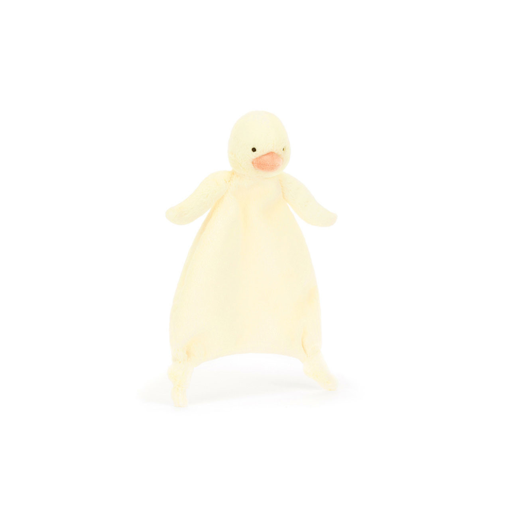 A gorgeous first gift for newborns, the Bashful Duckling Comforter is cloudy-soft in a delicate pale yellow fur made with recycled fibres. Designed for calming cuddles with an un-stuffed tummy yet squashy soft wings and feet. With a pale orange beak and embroidered face features, this sweet duckling is a present to treasure.