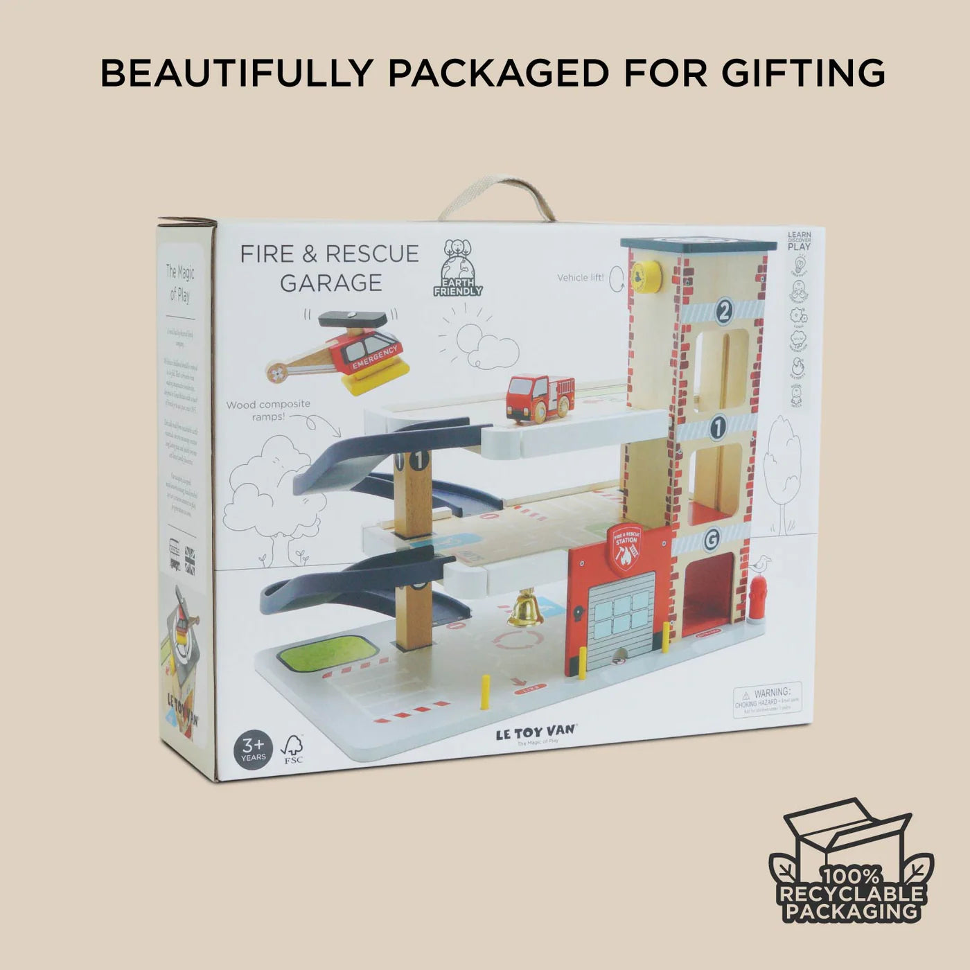 Roll on to new adventures with this stunning George’s toy garage. Crafted from durable, FSC® - certified wood, this high quality toy features an exciting fire and rescue theme, complete with fire engine and helicopter. Built to withstand day after day of inspired play, little ones will be on standby ready for the next emergency as they discover the working bell, wind up car lift, wood composite ramps, opening and closing emergency door, heli-pad and parking bays. A wonderful toy to develop imaginations during realistic play sessions.