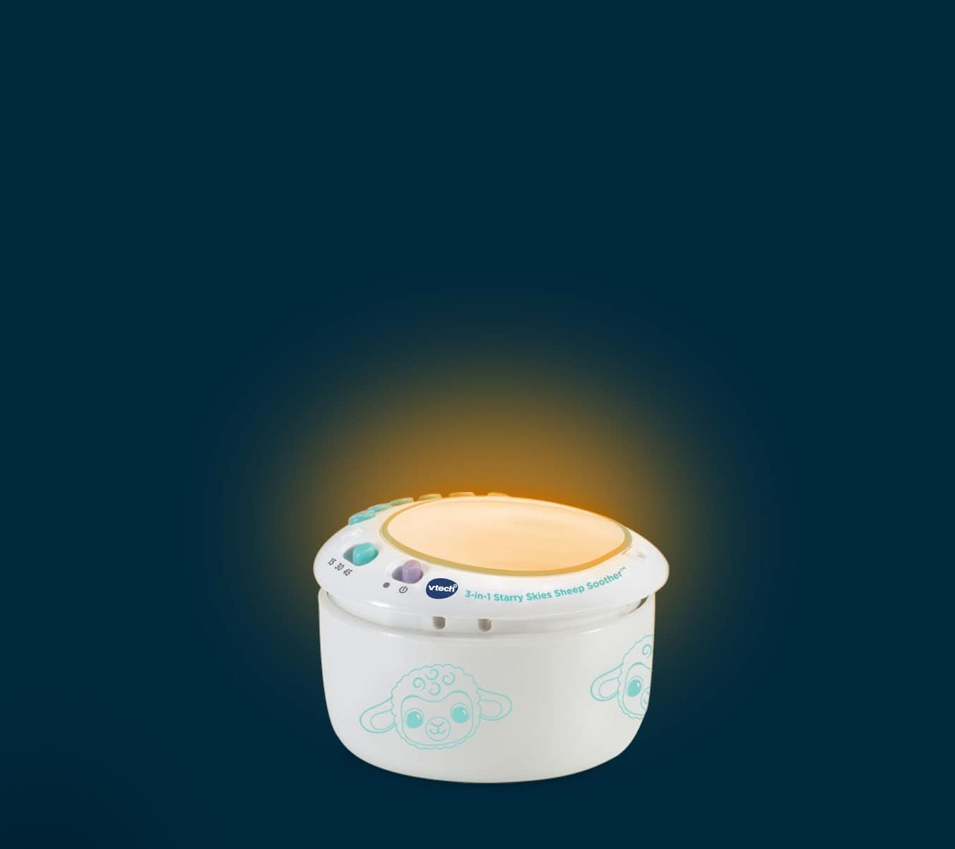 Find sleep without counting sheep with the 3-in-1 Starry Skies Sheep Soother™. With three ways to use, this soother includes a projector, glow light and nursery rhyme mode. Soothing lights and sounds set the stage for peaceful rest. Three discs easily attach to the projector to provide a soothing, glowing night-light or two patterns of light effects—and the discs store inside the plush sheep when not in use. Nature sounds, lullabies and melodies create a calming soundscape. Use the volume and timer settings on the projector to choose the volume and how long music, sounds and lights play. Your baby's cries activate the soother to turn on again, helping them learn to self-soothe. When your little one awakens, switch modes to play five nursery rhymes. Hearing rhyming tales encourages language development in little listeners. When your child is old enough, remove the electronic module to create a cuddly, plush pal. Sleep is sweet with this soothing sheep! Intended for ages Birth+. Requires 2 AA batteries. Batteries included for demo purposes only. New batteries recommended for regular use.