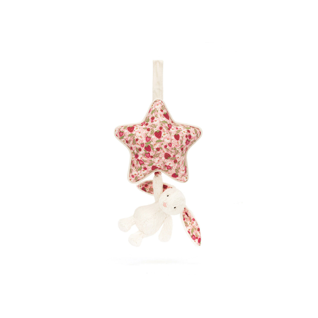 An enchanting newborn gift, let babies dream sweetly with a Blossom Cream Bunny ‘Berry’ Musical Pull. Our most loved Bashful Bunny, in soft cream fur made from recycled fibres can be gently pulled to hear an original Jellycat lullaby. The strawberry patterned star in an original Jellycat print can be attached to a crib or pram with a Velcro fastening.
